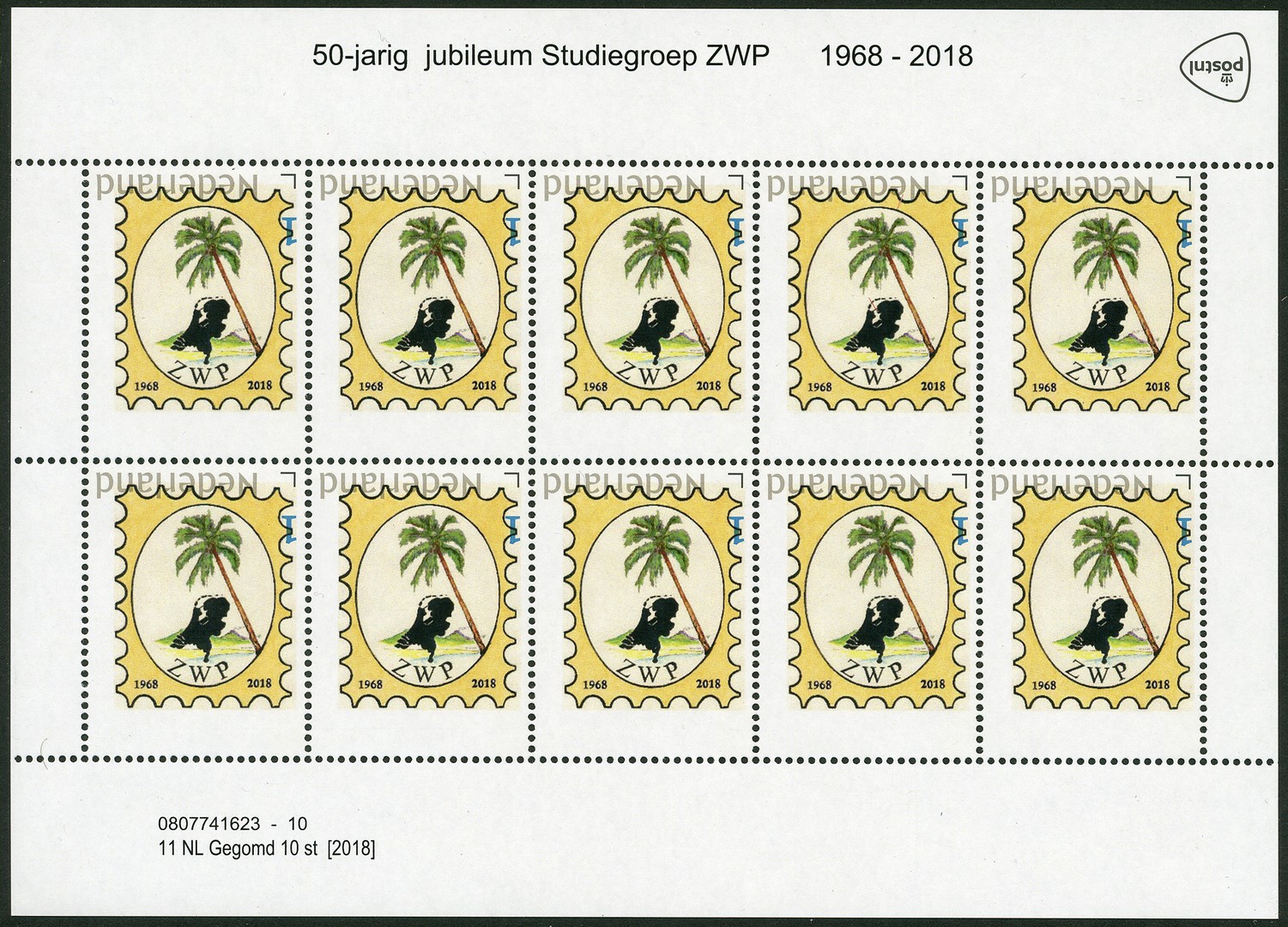 Velletje persoonlijke postzegels t.b.v. ´50-jarig jubileum Studiegroep ZWP 1968-2018´ met variëteit ´Kopstaande druk´