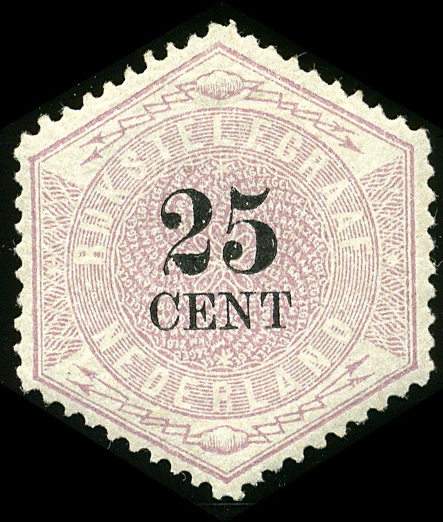 7, 25 cent lila en zwart, mooi getand en gecentreerd prachtex. met originele gom en kleine plakkerrest € 1925