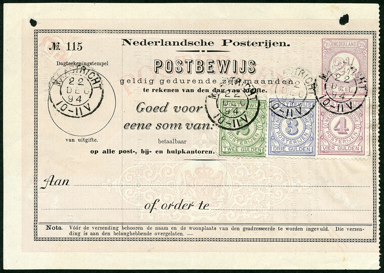 1, 2 en 6A resp. 3, 4 en 5 resp. 7 op drie frisse postbewijsformulieren G7 (enkele gaatjes), alle afgest. Maastricht 22-12-1894. De 3 en 5 gulden zijn zeer fraai, de overige zegels prachtex. Zeldzame set!