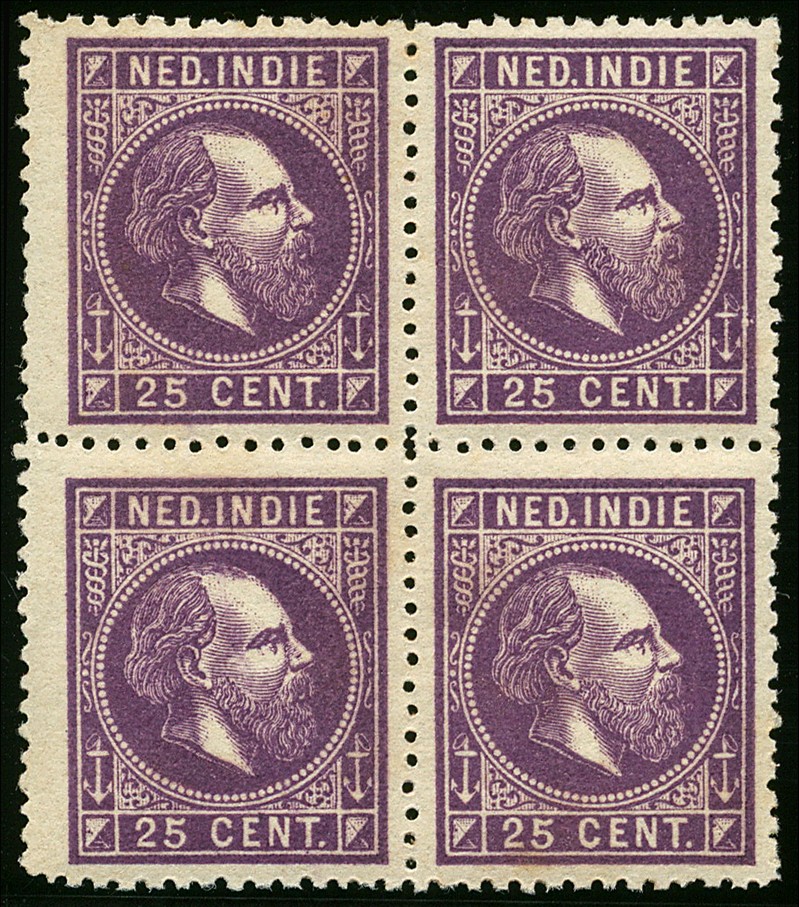 13E, 25 cent donkerpaars in kt. 13½:13¼ gr.g. in postfris vrijwel prachtblok van vier, gom iets ingedroogd, zeer lichte en onbeduidende verticale plooi door linker zegels. [€ 1000]