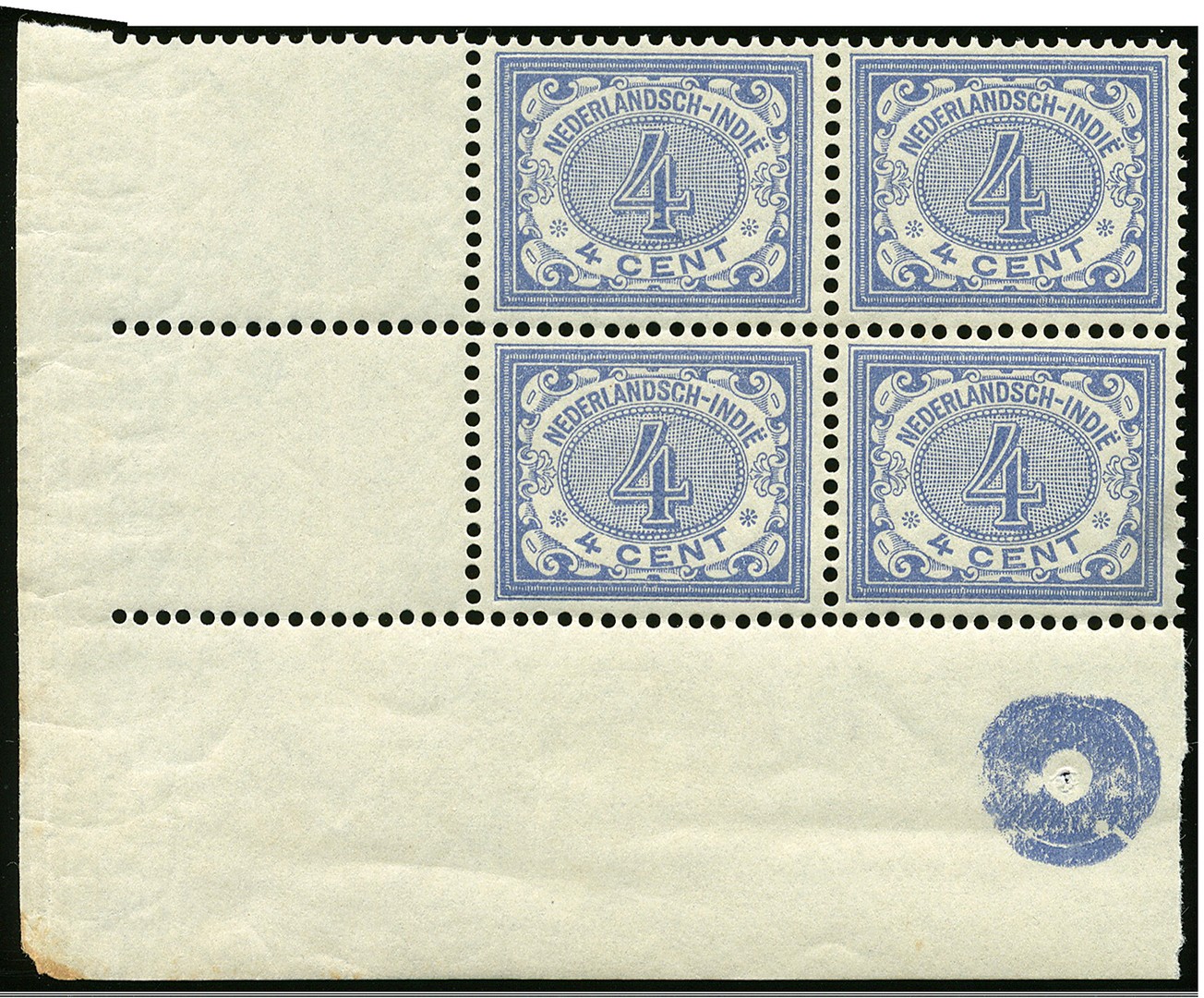 45, 4 Cent ultramarijn, postfrisse randblokken van vier en van zes. € 500