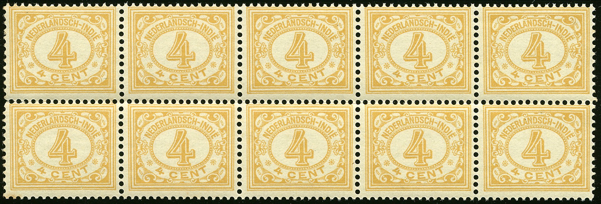 109, 4 cent geelbruin, 20 stuks in postfrisse veldeeltjes, enkele ex. met miniem bruine puntjes, overigens prachtex. € 1100