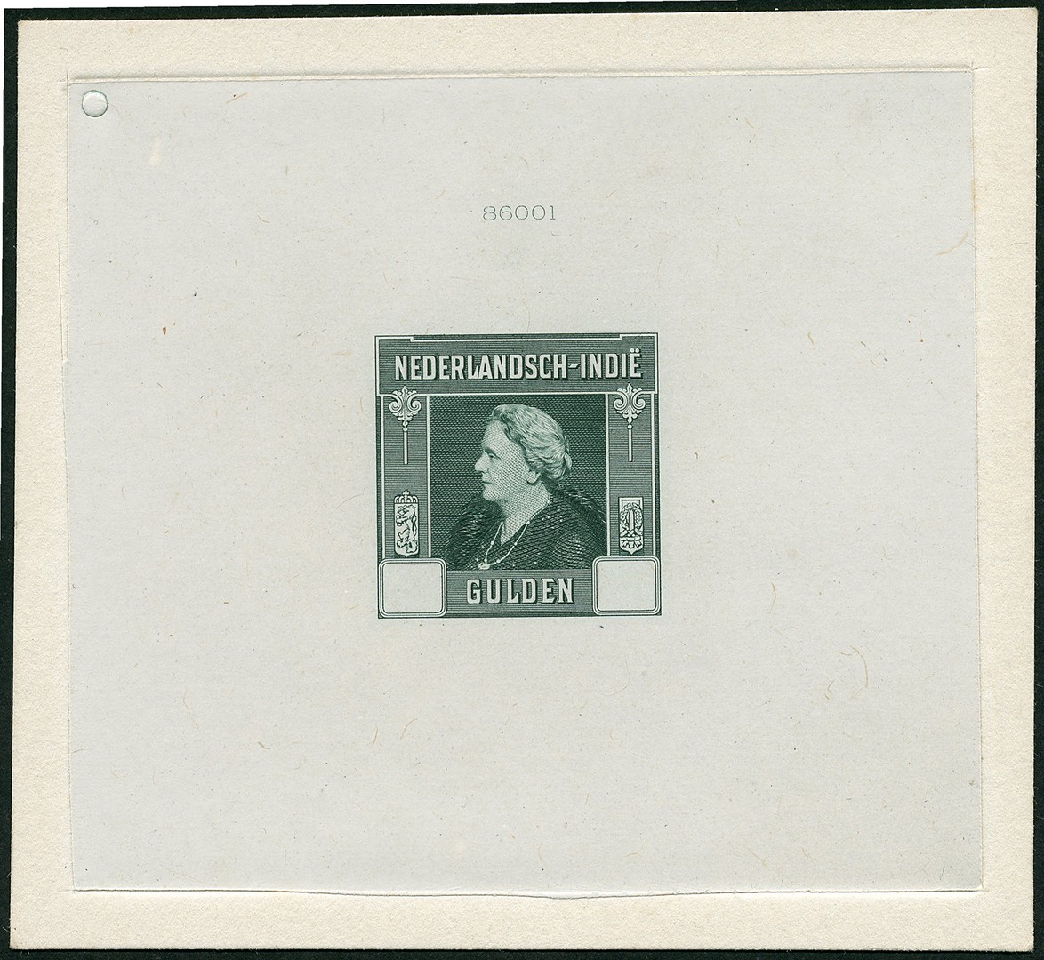 Proef op dun papier op kartonnetje met de beeltenis van Koningin Wilhelmina met "Gulden", zonder waarde-inschrift, in grijsgroen € -.-