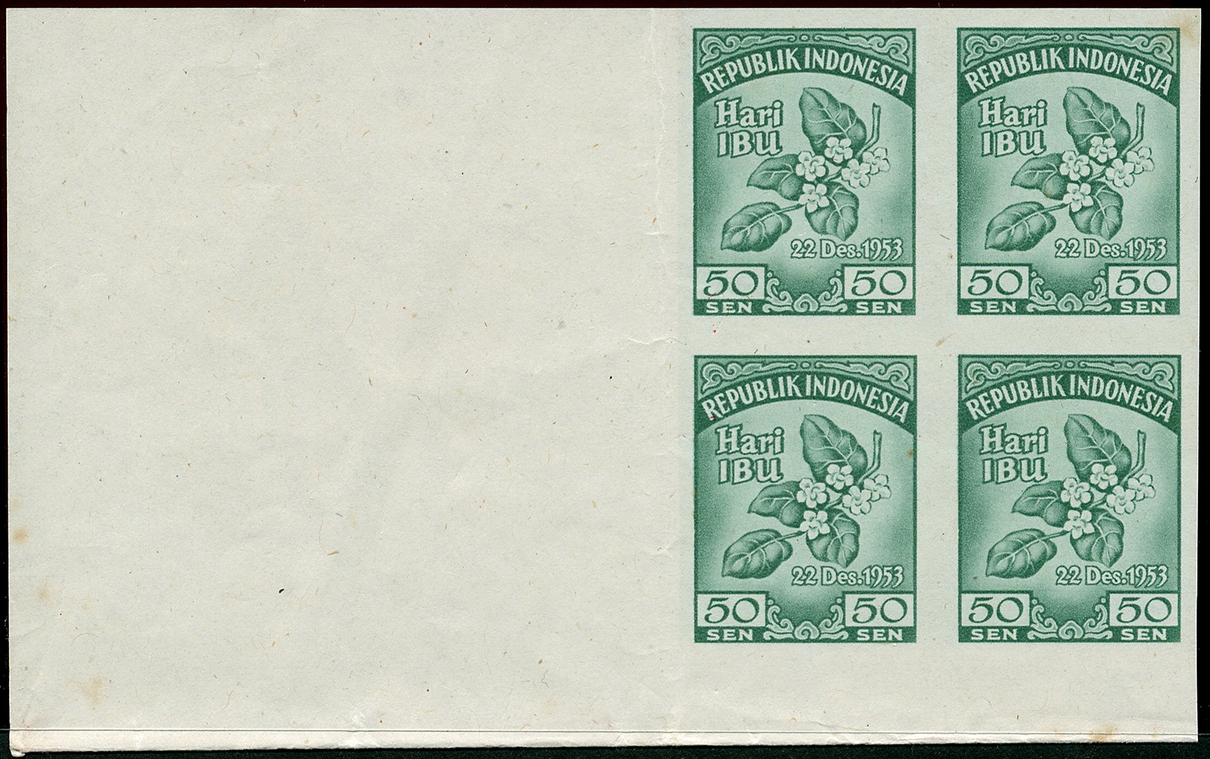KPI.118A, Moederdag 1953, ongetand en ongegomd, vrijwel pracht hoekblok van vier met maximale, maar gevouwen velrand. Rp. 6.000.000