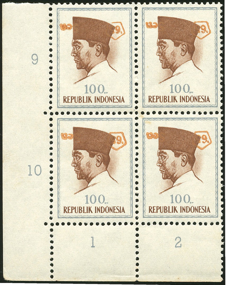 KPI.504b, 506b/510b, President Soekarno met kopstaande opdruk ´´65´ in vijfhoek en ´Sen´ in postfrisse blokken van vier