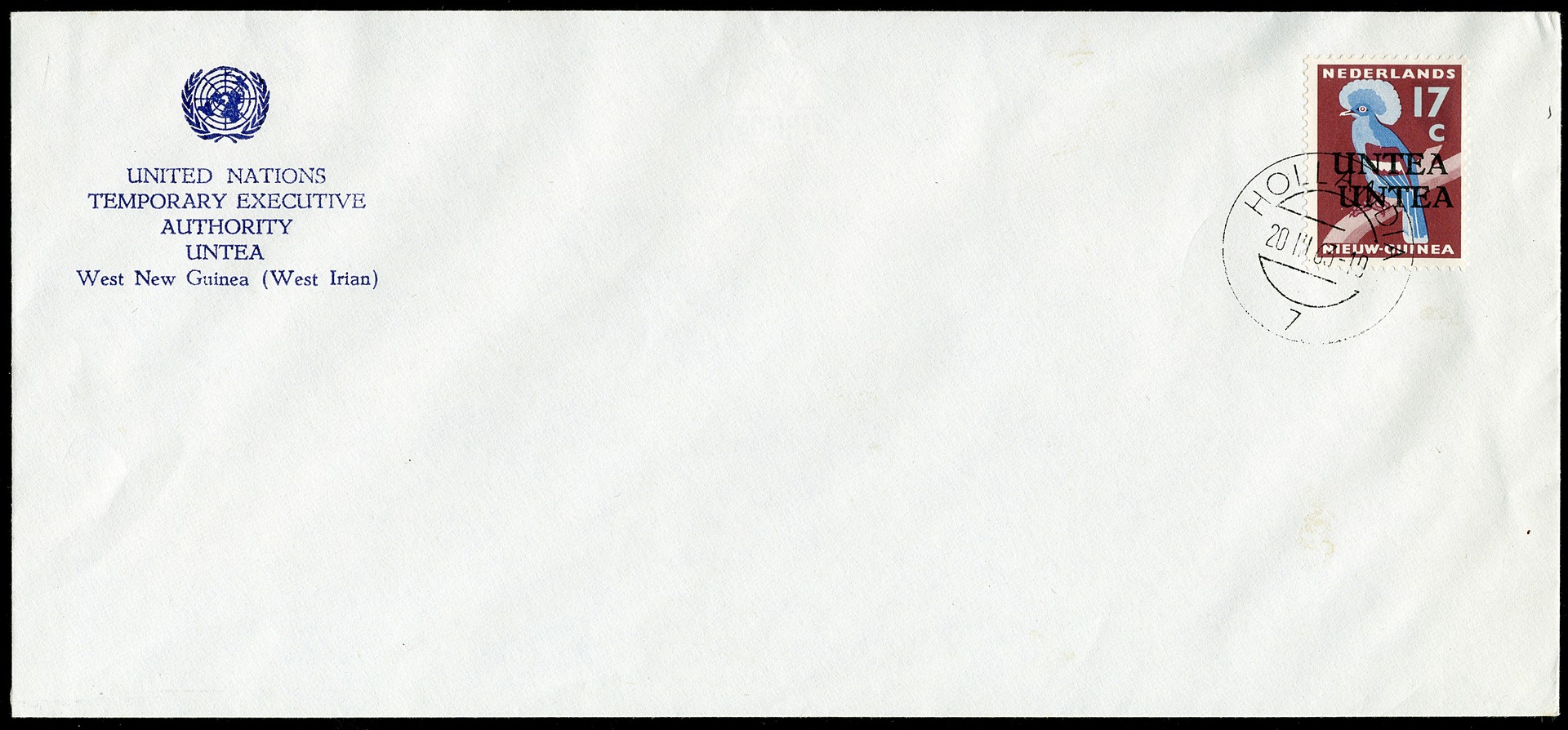 8fa, 17 cent met dubbele opdruk op blanco UNTEA-couvert met verzoekafst. Hollandia 20-3-1963. Echt gebruikt onbekend, oplage 100 stuks. € 250