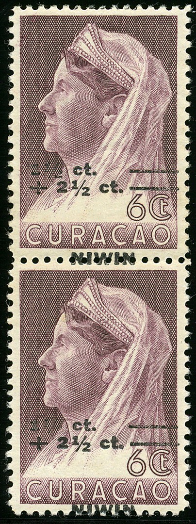 182a, 1½ + 2½ ct. op 6 ct. bruinviolet, postfris verticaal paar met verschoven opdruk Niwin, prachtex. € 160