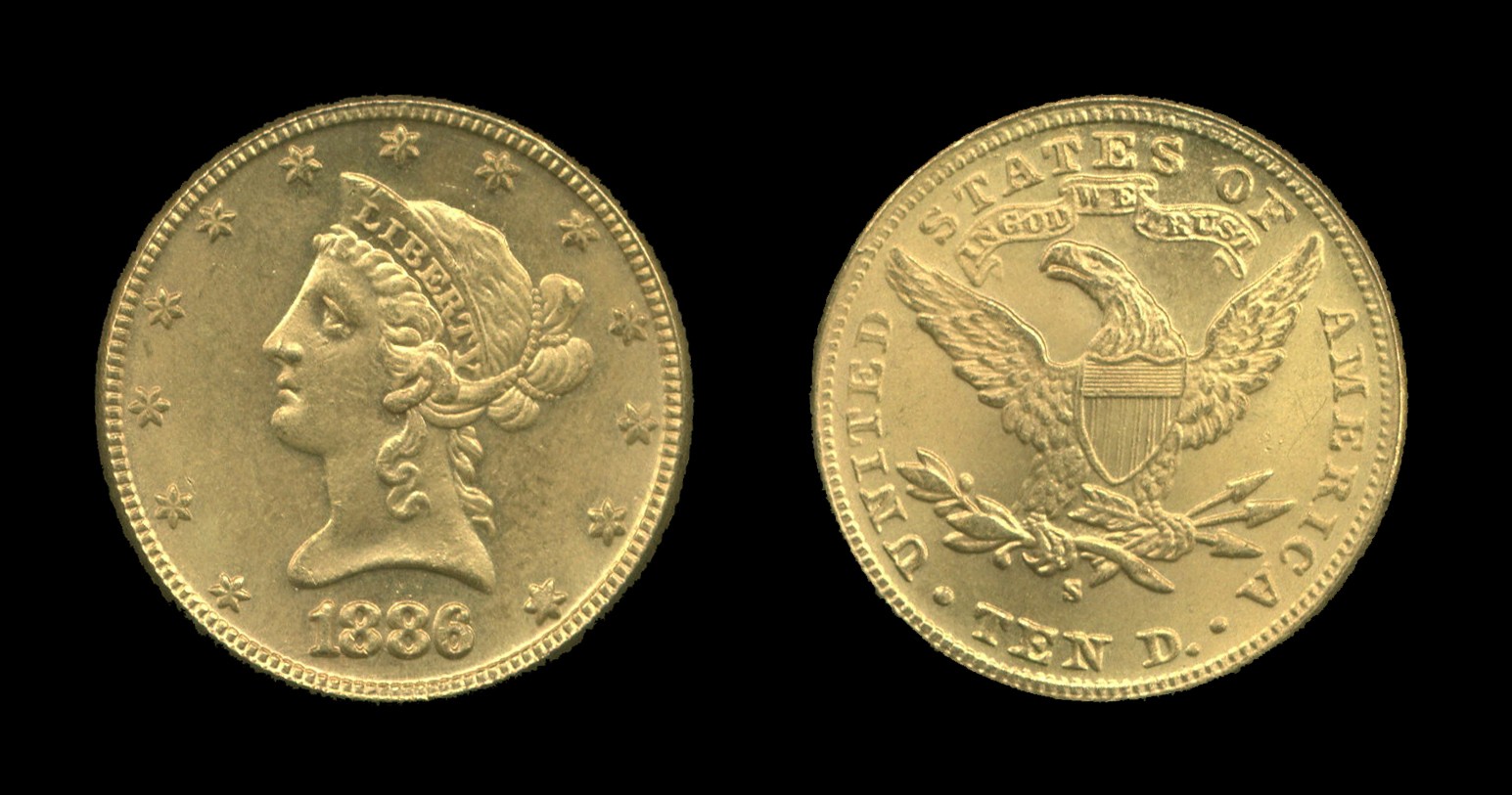 USA, 10 Dollar 1886S, 'Coronet Head' (Km.102) goud, PR