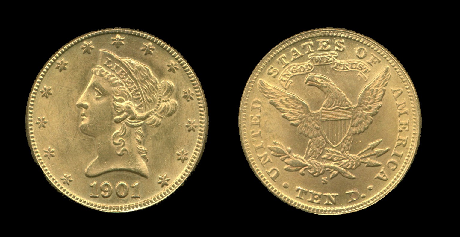 USA, 10 Dollar 1901S, 'Coronet Head' (Km.102) goud, ZF/PR