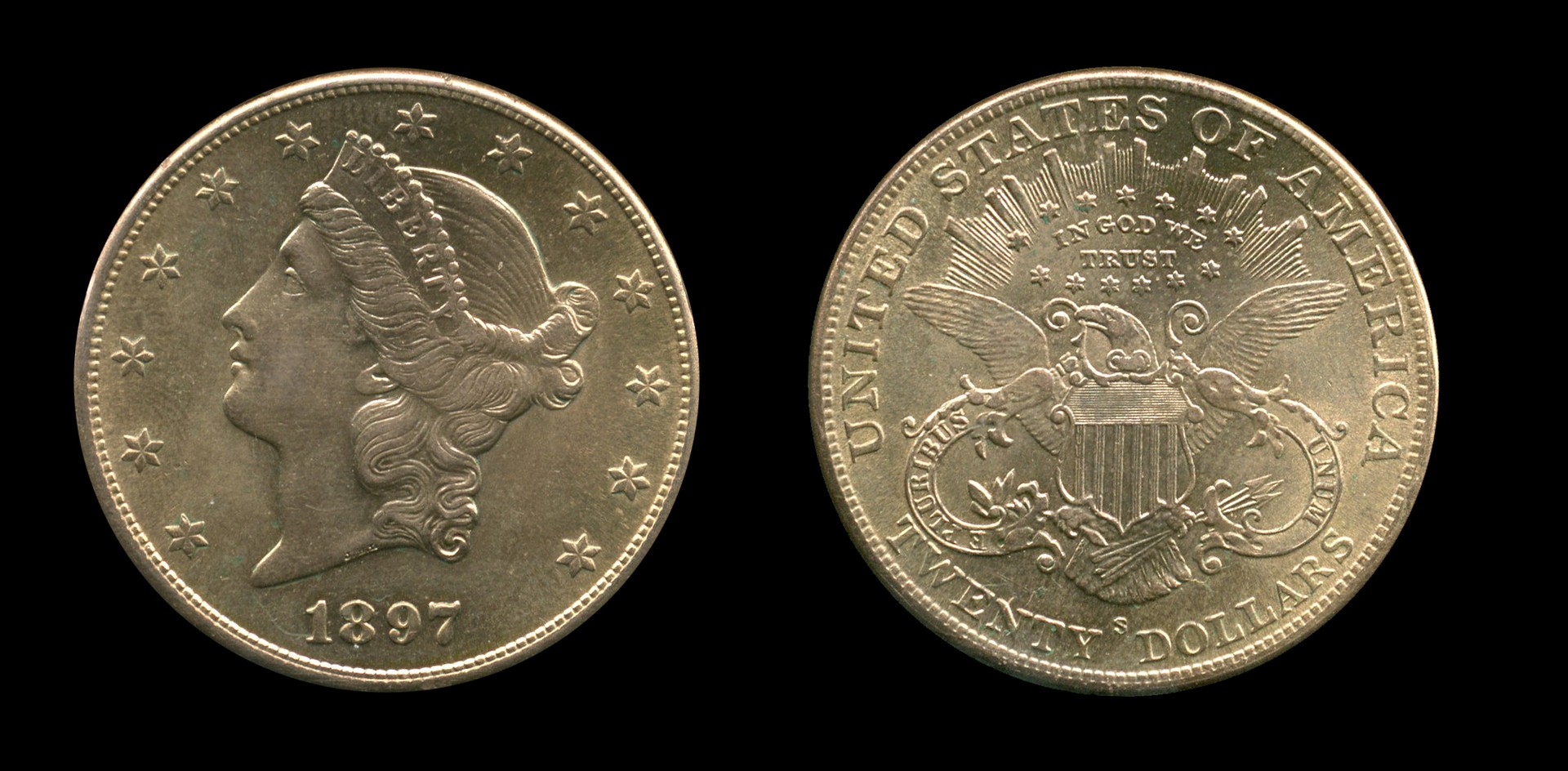 USA, 20 Dollar 1897S, 'Coronet Head' (Km.74,3) goud, ZF