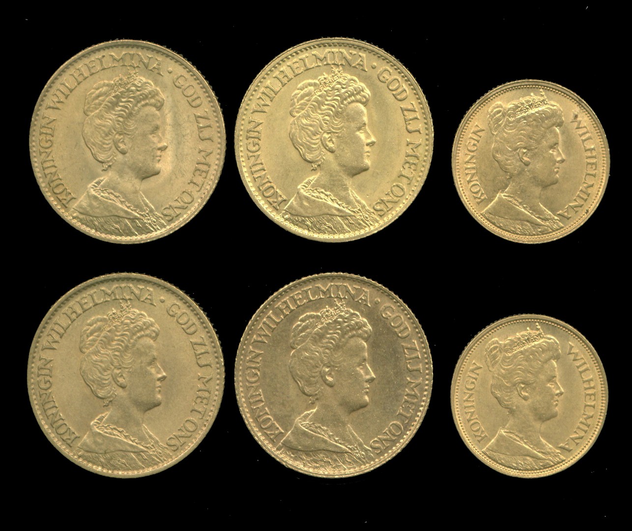 NEDERLAND, 4 x gouden 10 Gulden Wilhelmina 1911, 1912, 1913 en 1917, alsmede 2 x gouden 5 Gulden Wilhelmina 1912
