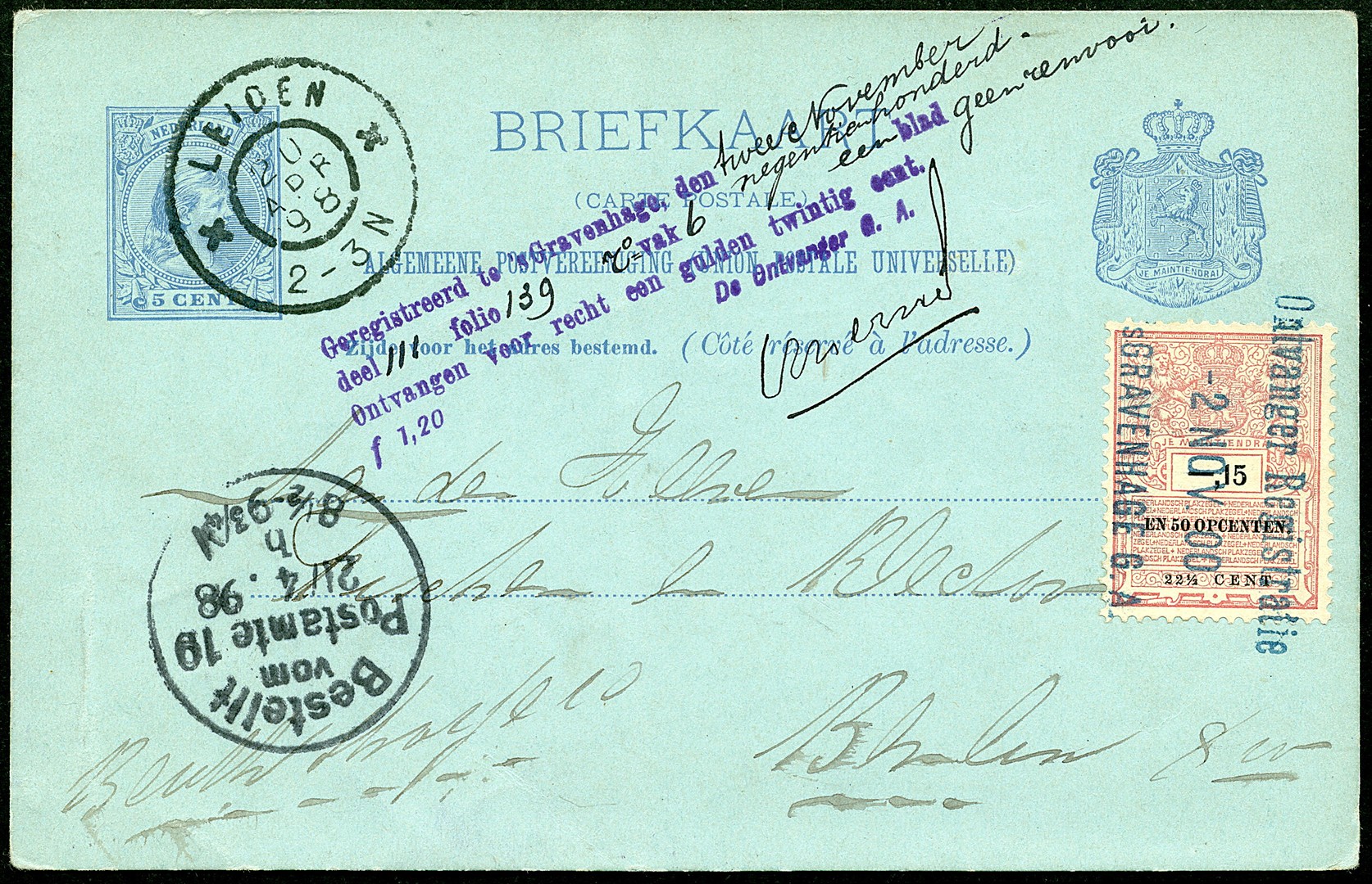 Bk. G36 uit Leiden 20-4-1898, ergens in Duitsland op 21-4 afgest. Vervolgens op 2-11-1900 te ´s-Gravenhage geregistreerd en voorzien van een fiscaalzegel (plakzegel) van 15 cent