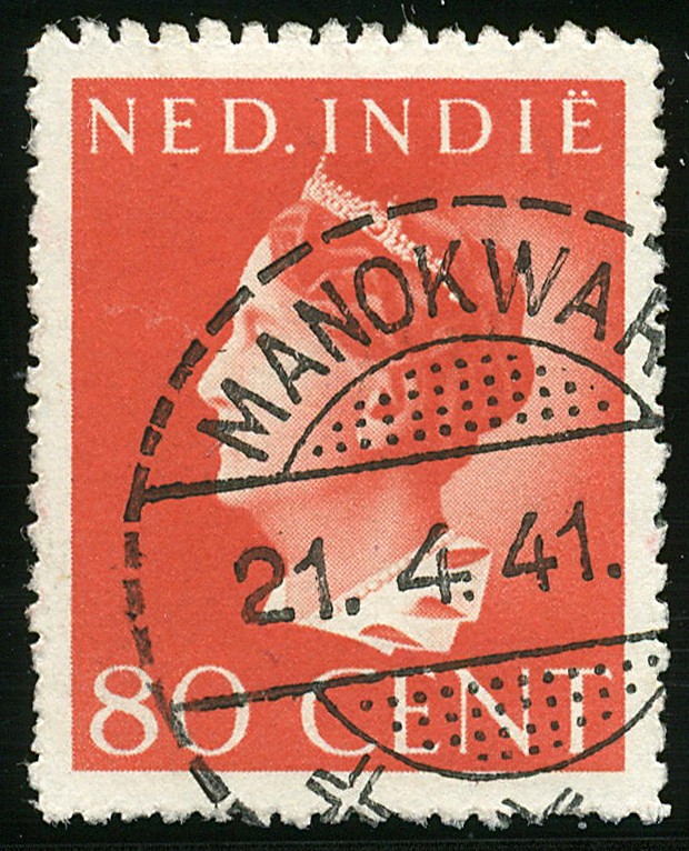 Puntvlakvulling type PV2 van MANOKWARI op 80c Van Konijnenburg. Prachtex. met zeer scherpe afst. op deze rode zegel