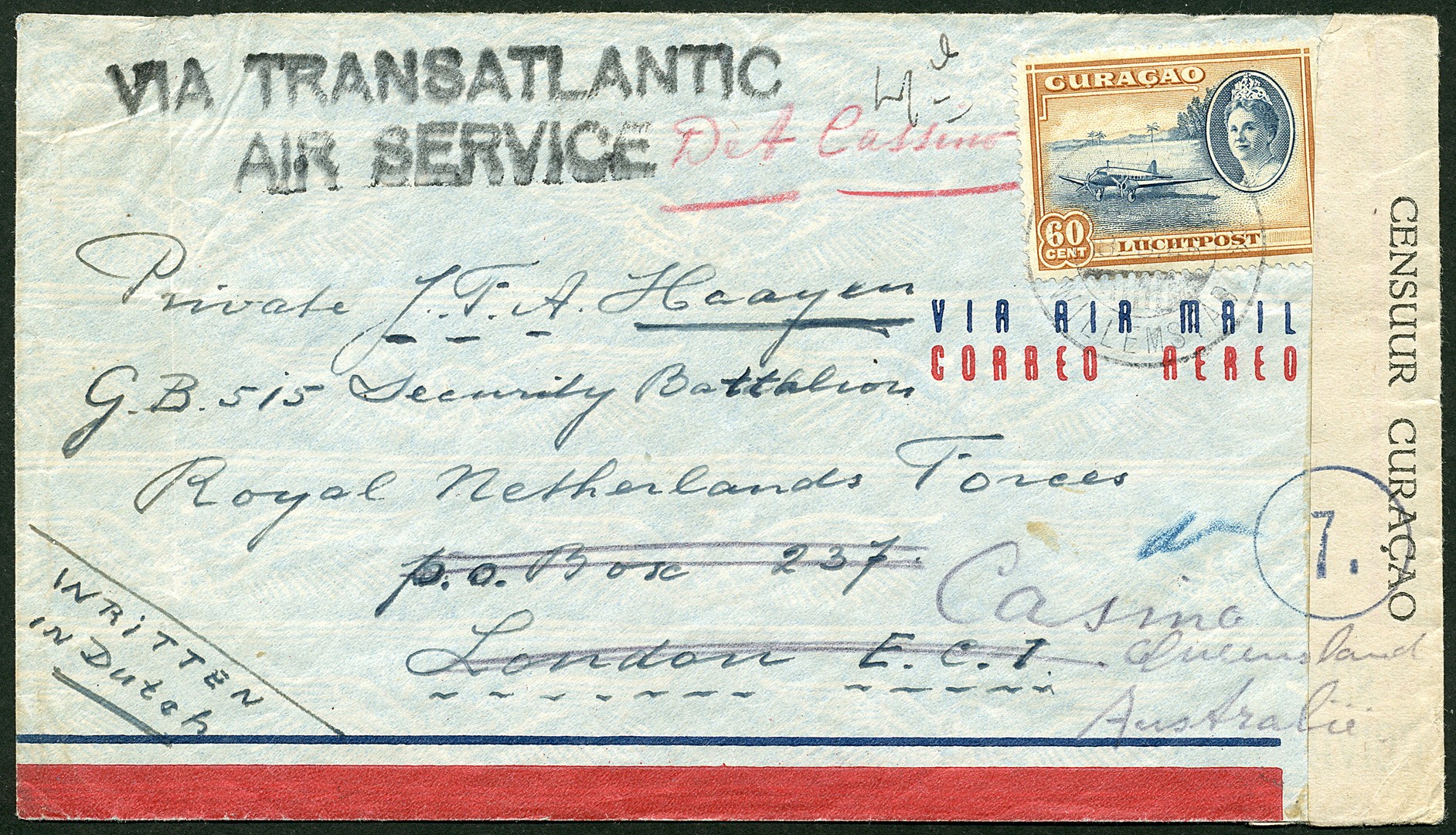 Luchtpostenv. met enkelfrankering 60c LP35 van Willemstad 18-6-1945 'Via Transatlantic/Air Service' eerst naar Londen, doorgez. naar Australië met censuurstrook en 7. in cirkel