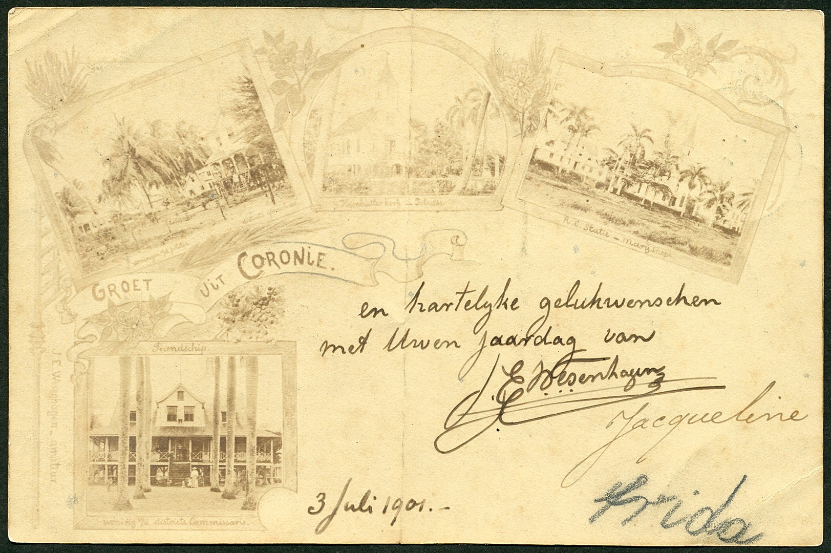 Twee minder mooie bk. G11 (allebei vouw) afgest. CORONIE 7-3-1901 resp. 4-7-1901 met op schrijfzijde foto´s erop gedrukt door geneesheer/fotograaf J.E. Wesenhagen, verz. naar familie in Paramaribo