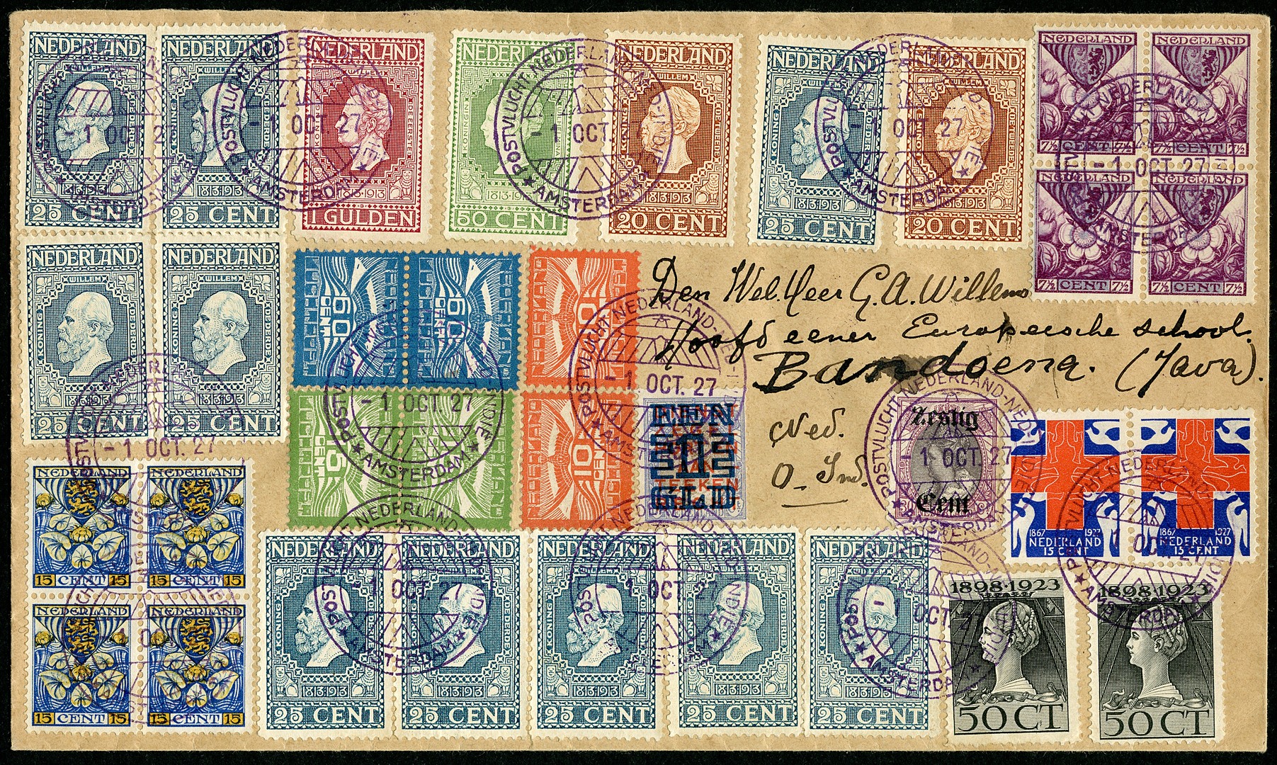 Nederland. Koppenvlucht. Zeer rijkelijk en kleurrijk gefr. couvert waarop o.a. zegels van emissies Jub. ´13 en ´23 (ook op az.), tezamen fl. 10,15 op 1-10-1927 naar het ´Hoofd eener Europeesche school´ te Bandoeng 11-10. Decoratief!