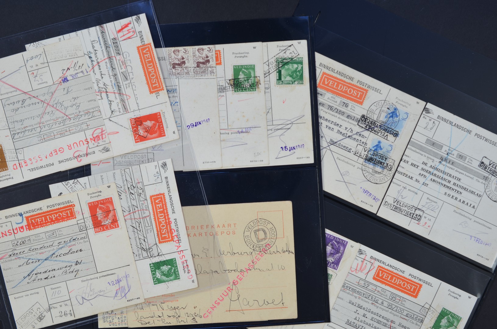 NED.- INDIË VELDPOST 1941-42, 60 veldpoststukken (enveloppen, briefkaarten, postwissels) met diverse frankeringen, veldpoststempels (sorteerkantoren, distributiekantoren), censuren, etc.