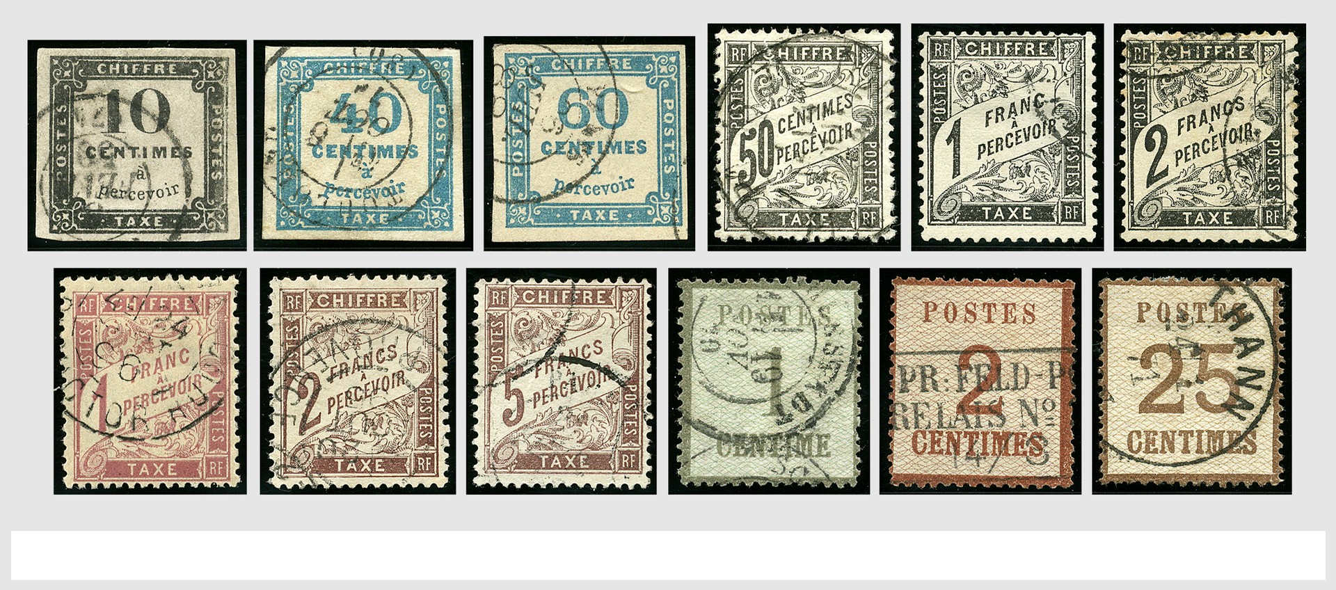 FRANKRIJK, Port 1859-1971, o/* collectie op albumbladen met veel goede nrs. w,o, Yv.1, 6, 7, 9, 22, 23, 26, 27, 39, 5 brieven, blad met FM opdrukken en 3 FM brieven zonder zegels, tevens bezetting Elzas