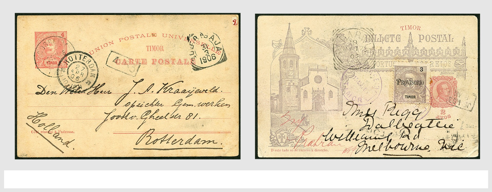 PORTUGEES TIMOR, briefkaarten van 2A bijgefr. met 3A naar Melbourne (1903) en van 4A over Soerabaja naar Rotterdam (1906)