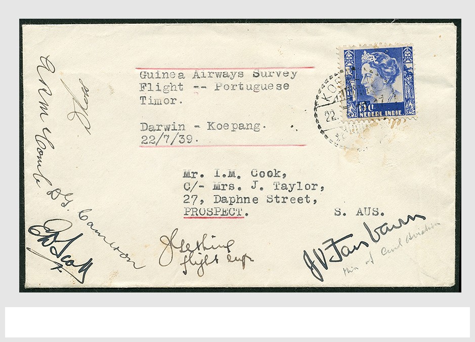 PORTUGUESE TIMOR. Airmail. Guinea Airways Survey Flight from Adelaide via Darwin and Koepang to Dilly. Cover bearing 15c from Koepang 22 July 1939 to Prospect, South Australia, showing six autographs by the crew members
