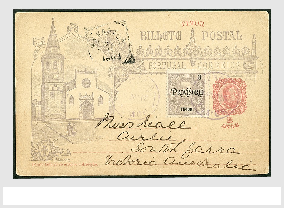 PORTUGUESE TIMOR. To Australia/Victoria. 3 avos on a 2a postcard on 13 Oct 1903 via Makassar 22 Nov and Soerabaja 28 Oct to a Miss in Airlie, a house of historical significance, built in 1873, in South Yarra