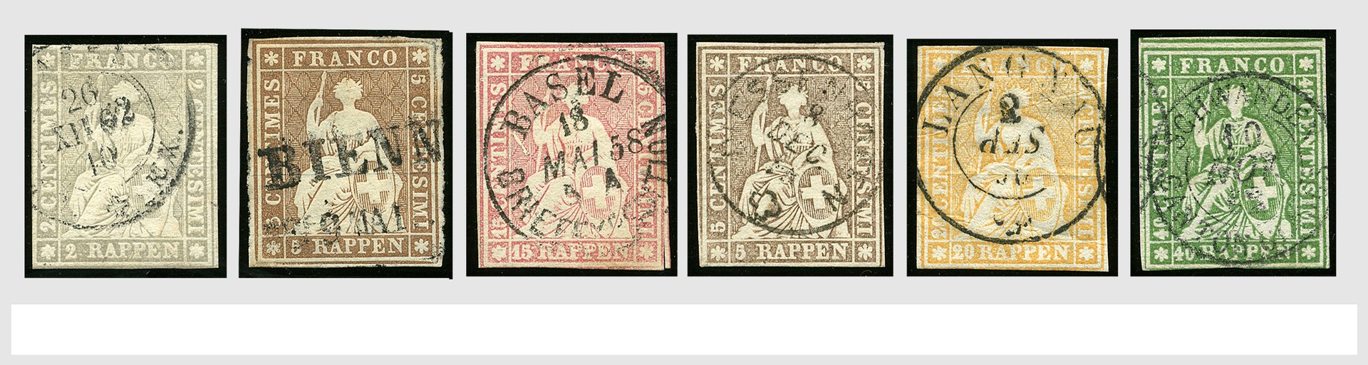 ZWITSERLAND, Zittende Helvetia, zgn. 'Strubel', geheel gebruikte selectie met kleurvariëteiten, stempels, etc., op insteekbladen