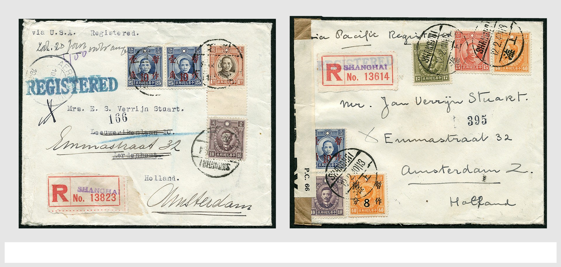 CHINA, two registered covers 1939-40 from Shanghai via the U.S. to the Netherlands, the first franked with 10c, 10 on 25c (2x) and 1$ from Dec 1939, the second franked with 10c, 15c, 17c, 40c, 8 on 40c and 10 on 25c from 12 Feb 1940 and having two different censor labels