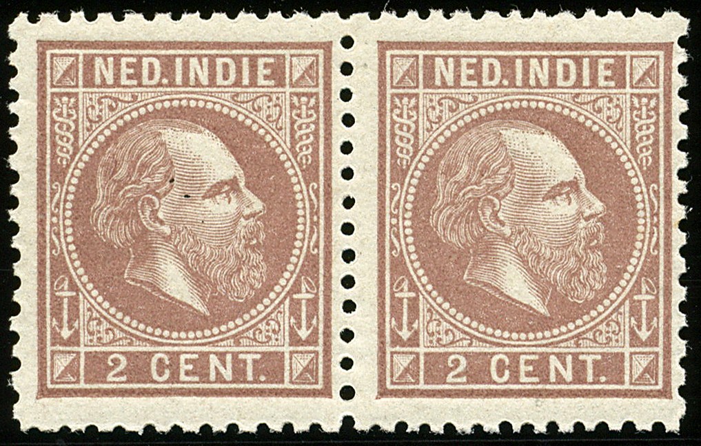 5G + 5F, 2 cent lilabruin in gecombineerde tanding, 11½ x 12, 12½ x 12, luxe postfris paar met certificaat Moeijes (1987). Cat.wrd. voor ongebr. bedraagt al € 1500++
