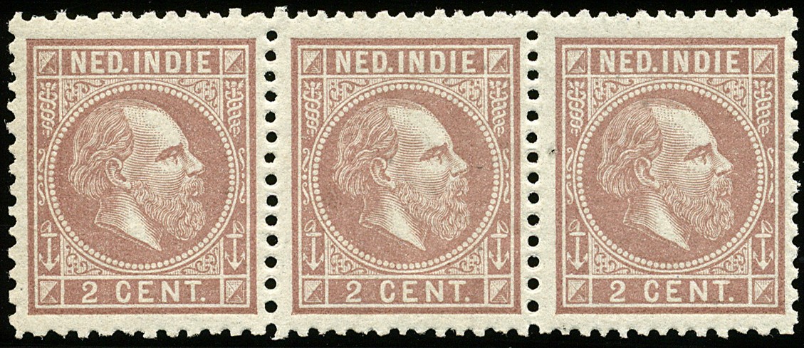 5G-5F-5F, 2 cent lilabruin in strip van drie in de gecombineerde tanding 11½ x 12, 12½ x 12, 12½ x 12, het middelste zegel ongebruikt, de rechter en linkerzegel postfris met paars eigendomsstempeltje. Prachtstrip en zeer zeldzaam! € 1500+