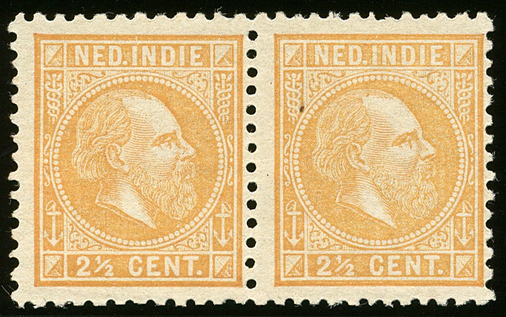 7G + 7F, 2½ cent geel in gecombineerde tanding 11½ x 12, 12½ x 12, ongebruikt prachtpaar zonder gom (€ 450)