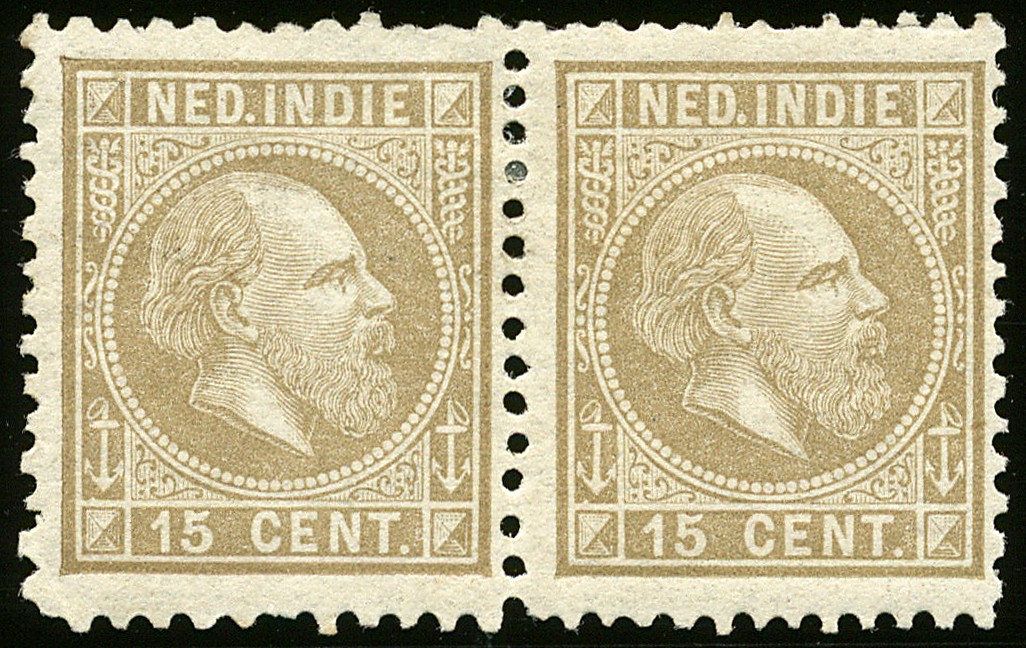 11G + 11F, 15 cent grijsbruin in de gecombineerde tanding 11½ x 12, 12½ x 12, ongebruikt, onregelmatig getand prachtpaar met meerdere plakkersporen en cert. Vleeming (2017). Zeer zeldzaam! € 1850
