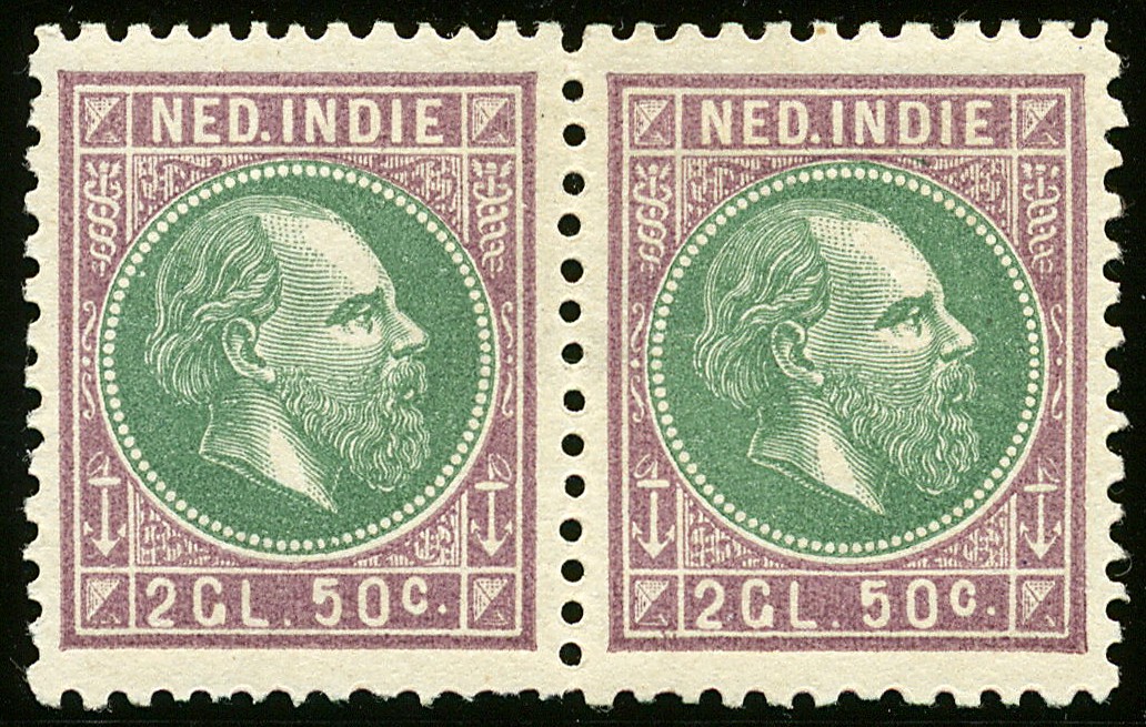 16F + 16G, 2½ gulden dofviolet en groen in de gecombineerde tanding 12½ x 12, 11½ x 12, luxe ongebruikt paar. Uiterst zeldzaam! €5250