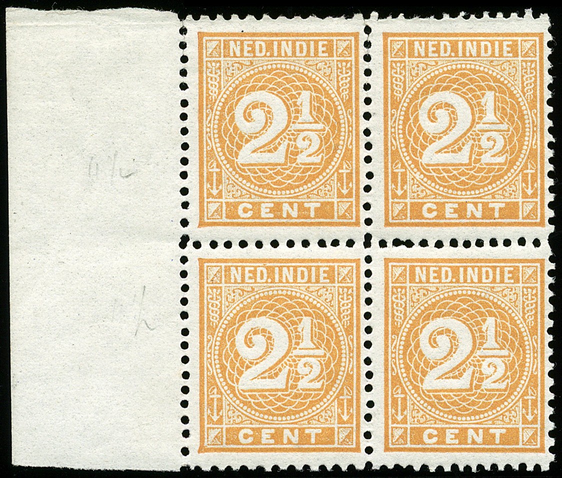 19B + 19A, 2½ cent oranjegeel, in gecombineerde tanding 11½ x 12-12½ x 12, beh. een enkel plekje, een postfris prachtblok € 200+
