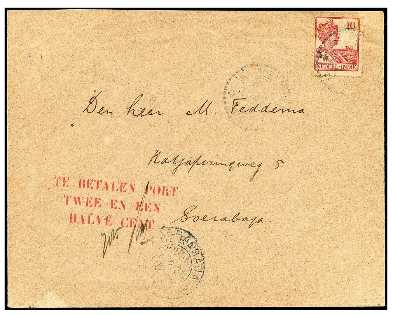 NP2, NP7, Noodportstempels op lokaal verzonden enveloppen van Soerabaja 4-2-1921 (NP2) en Weltevreden 10-2-1921 (NP7, lichte, kopstaande afdruk op envelop met vouw). € 950