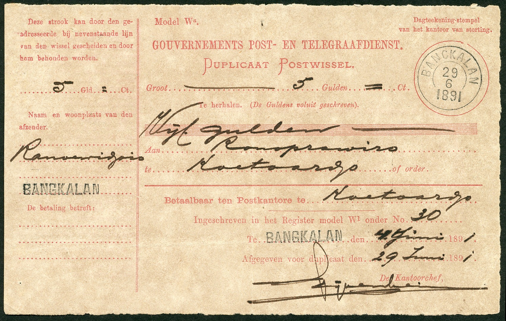 Duplicaat postwissel voor het overmaken van 5 gulden uit Banckalan 29-6-1891 (de eerste postwissel werd op 4-6-1891 verstuurd), uit te betalen te Koetoardjo. Uiterst zeldzaam postaal formulier waarvan ons geen tweede ex. bekend is!