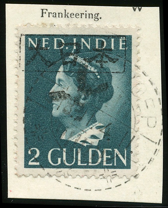 Sumatra. Benkoelen. 2 Gulden van Konijnenburg with combination of black large overprint Dai Ni Hon in straight frame and black cross overprint no. 841z/394z-55g on piece, cancelled Tjoeroep. € 300