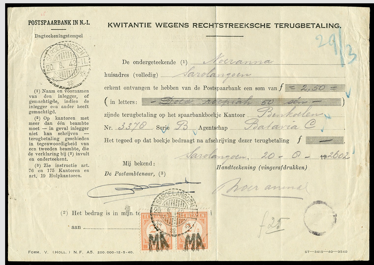 Sumatra. Djambi. Black overprint MA on 2½ cent postage due in pair no. 412z-78a on receipt for automatic debit from the savings bank (in Dutch language) Bu.JF18d (RRR), cancelled Saroelangoen 20.8.42.11. Cat. value stamps € 400. Extremely rare postal form!