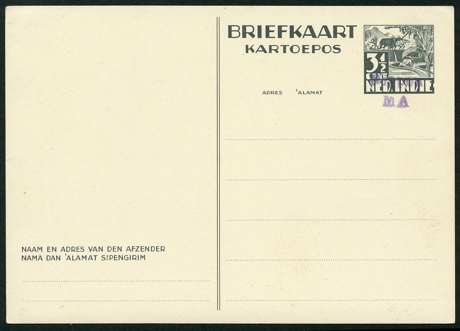 Sumatra. Djambi. 3½ Cent postcard and 7½ cent letter sheet (signed Boekema) both with violet two-lined Nippon/MA overprint type 421 and 7½ cent letter sheet with black two-lined NIPPON/MA overprint type 433, all unused