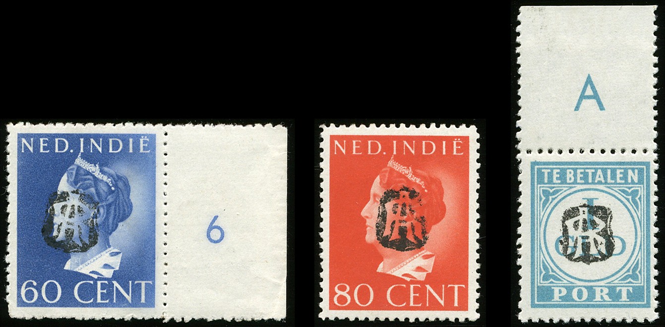 Sumatra. Palembang. Signet ring overprint AR of postmaster Arifin in black, used locally in Loeboek Linggau no. 521z on a nice selection of 19 different unused stamps type Van Konijnenburg and postage dues, some signed Boekema. Cat. ca. € 1,100