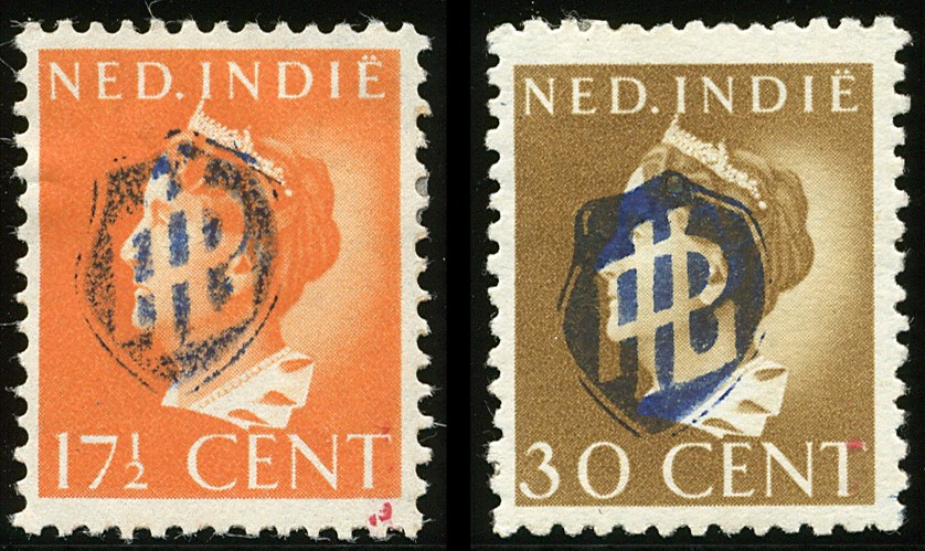 Sumatra. Palembang. Signet ring overprint IPL of postmaster I.P. Lengkong in blue on 17½ and 30 cent Van Konijnenburg nos. 522b-45 and 48, unused. Signed Boekema. € 280