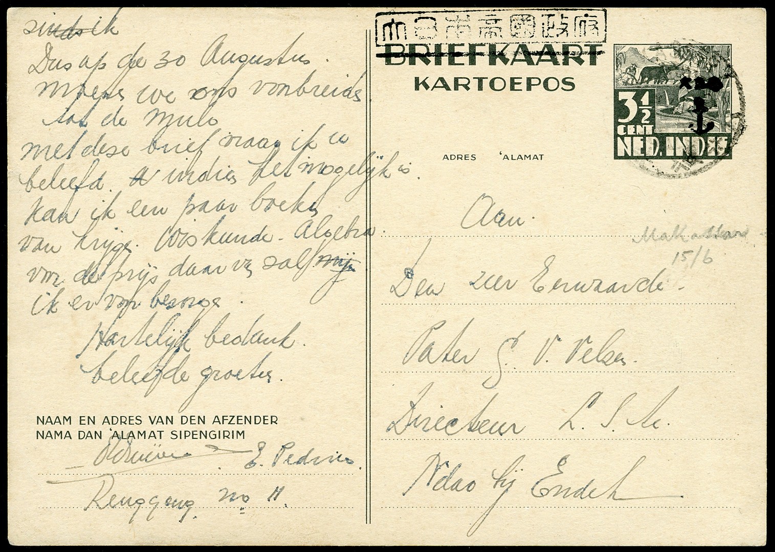 South Celebes. 3½ Cent postcard with black small anchor overprint and 7 characters in frame (Dai Nippon Teikoku Seifu) Bu.236a from Makasser 15.6.47.9 (vNV.020), thus after the Japanese occupation, to Father G. van Velzen in Ndao (probably meant Ndona) near Ende on the island of Flores. Father van Velzen was interned at Pare Pare (Celebes) but returned to Flores after the war. The writer asks in the Dutch language for some schoolbooks. Very rare and late usage of this postcard