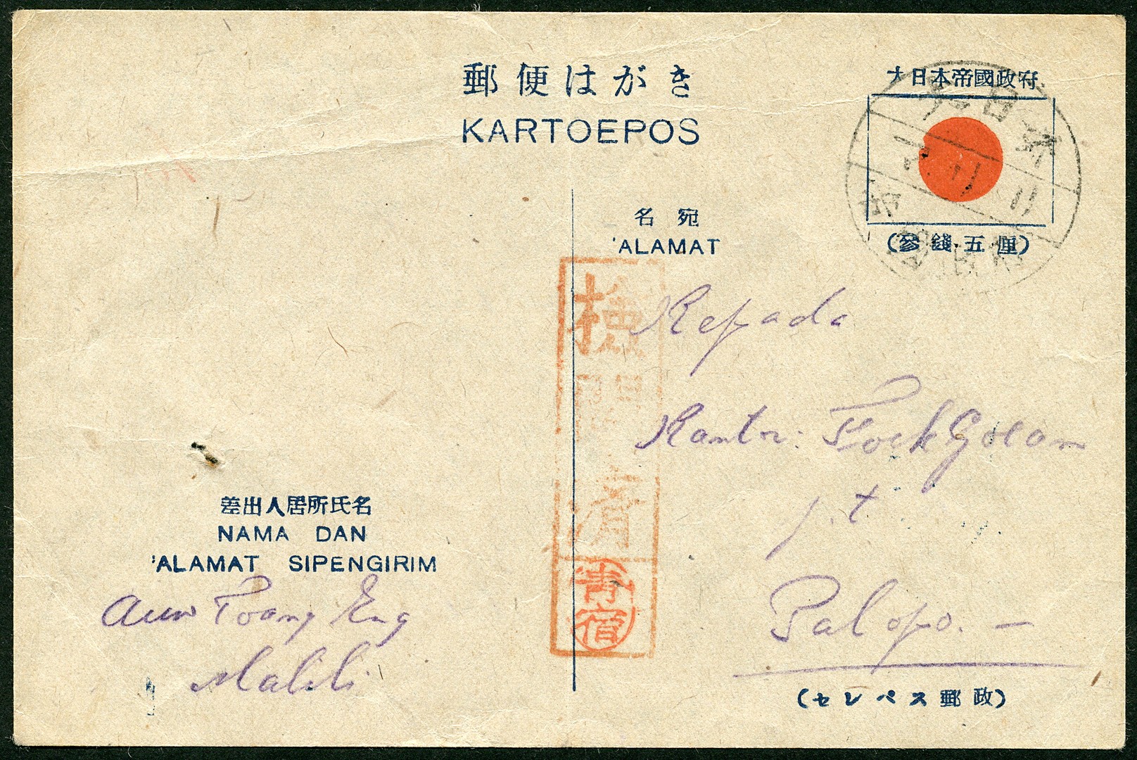 South Celebes. Postcard on thin paper with under Hinomaru 4 characters (= 3½ sen) Bu.256 (few minor faults), written in Feb 2604, from Malili (Teikoku Seifu cancel type 300) to Palopo. Censor Vr.201c