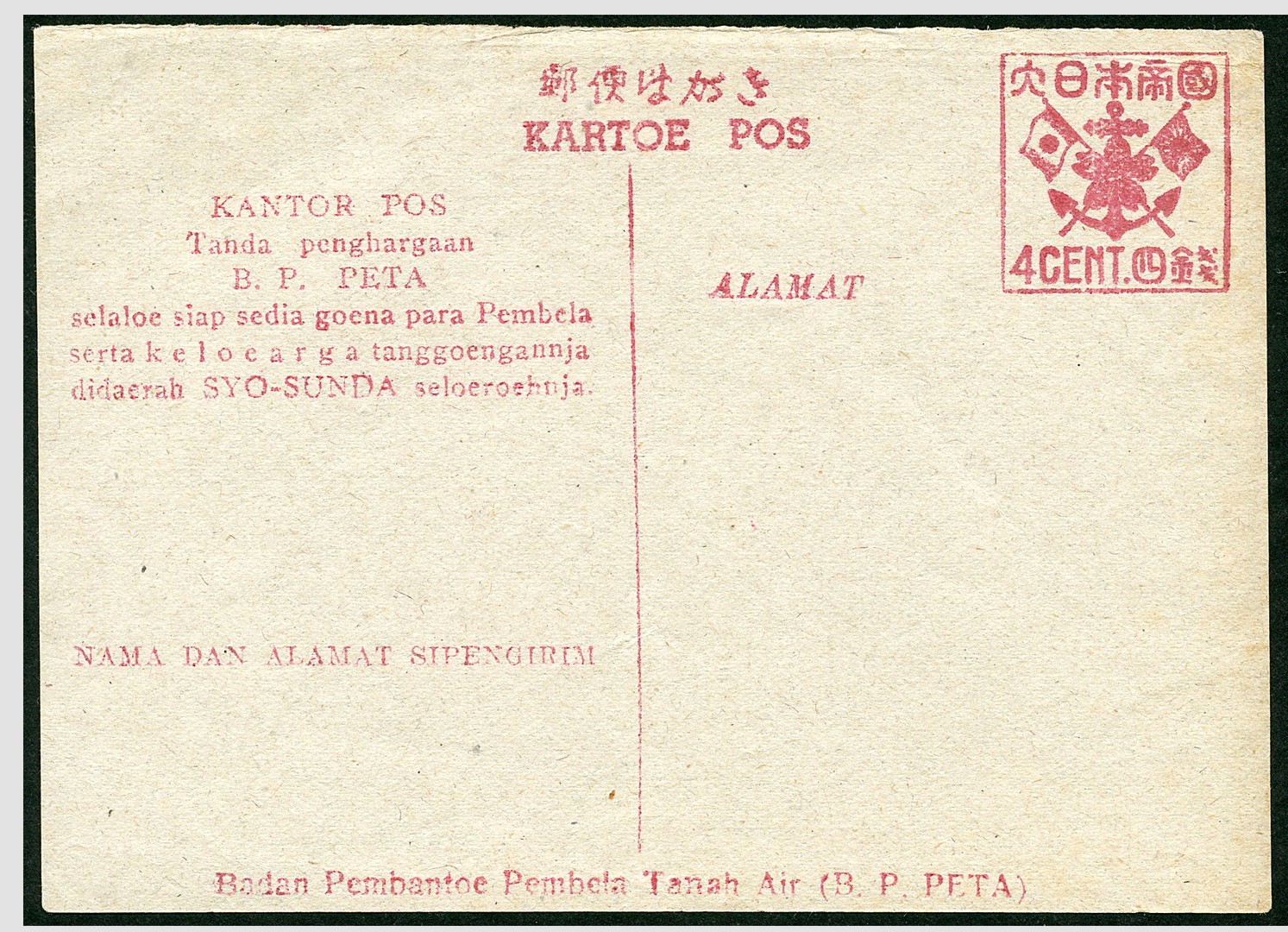 SOUTH AND EAST BORNEO. MILITARY POSTCARD OF 4 CENT WITH ANCHOR AND TWO CROSSED FLAGS FROM THE B.P. PETA (= BADAN PEMBANTOE PEMBELA TANAH AIR, AN INDONESIAN ARMY GROUP SUPPORTED BY THE JAPANESE AND FOUNDED BY THE JAPANESE IN OCT 1943 ON JAVA), Bu.234 (RRR), UNUSED. THE PETA-CARD COULD HAVE BEEN AVAILABLE ON OTHER ISLANDS LIKE BALI. THE ONLY TWO USED CARDS THAT ARE RECORDED ARE FROM SINGARADJA AND BALIKPAPAN. SEE: J.R. VAN NIEUWKERK, p.78-82. THIS IS THE ONLY UNUSED COPY KNOWN. AN EXHIBITION ITEM OF GREAT IMPORTANCE! CERT. ´VAN DIETEN, 2019´