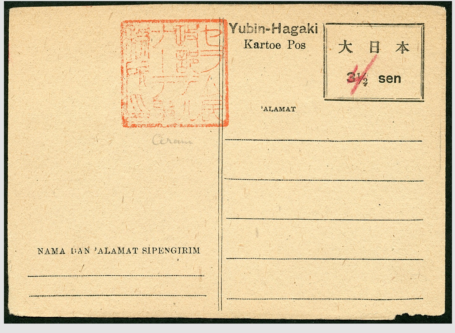 MOLUCCAS. TERNATE. 3½ SEN DAI NI HON POSTCARD WITH RED PENCIL RE-VALUED TO 4 SEN SHOWING IN RED THE TERNATE MINSEIBU AUTHORIZATION MARK, Bu.259b (RRR), UNUSED. THIS IS THE ONLY COPY KNOWN (USED IS ALSO NOT RECORDED). SEE: J.R. VAN NIEUWKERK, p.308. CERT. ´VAN DIETEN, 2019´ The card has a hardly visable vertical crease in the middle and a slight damage at the bottom right, which does not influence the uniqueness of the card at all