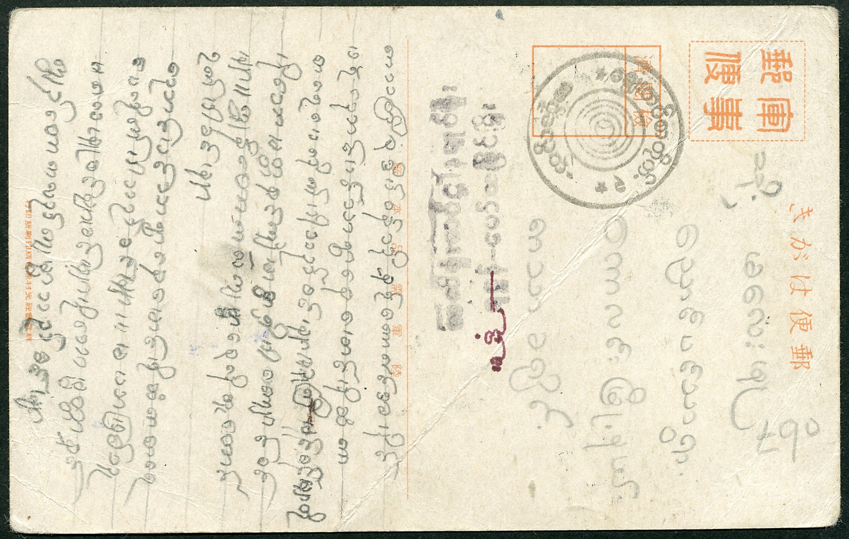 POW. Burma. Post from a romusha. Japanese picture postcard used by a Burmese laborer. The cds indicates postage free use (Jacobs BR12)