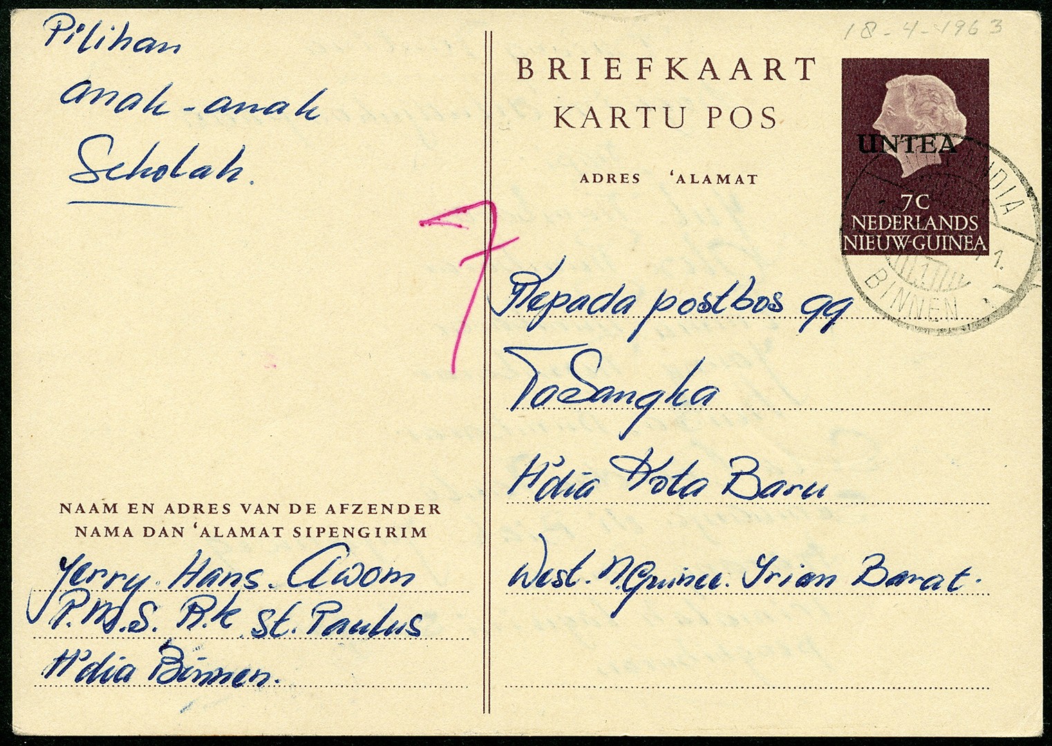 Bk. G3 met kleine opdruk type III van Hollandia/Binnen 18-4-1963 naar de RONG (Pb 99)