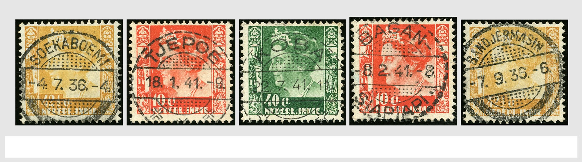 NED.- INDIË POSTHISTORIE, Puntvlakvullingstempels type PV1 en PV2 op losse zegels, verzameling van 62 verschillende kantoren type PV1 (o.a. Bengkalis, Blinjoe, Manokwari, Pemangkat, Rengat, Sintang, Terempa) en 48 type PV2 (o.a. Bengkalis, Blinjoe, Koba, Menado 16.3.40, Pekalongan, Sintang, merendeels prachtige en veelal complete afstempelingen, alsmede het zeldzame Pandeglang (superbe op gezegeld document van jan. 1936), op 3 insteekkaarten