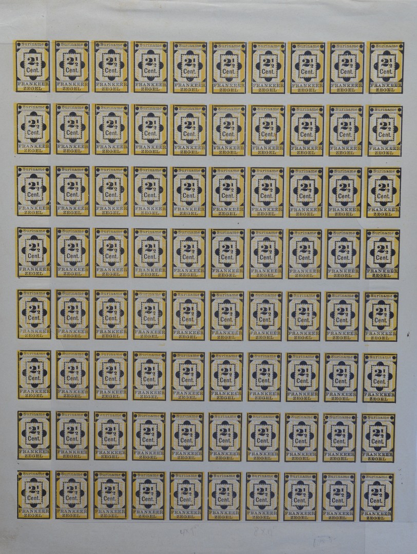 SURINAME, Hulpzegel 2½ cent 1892 nr. 22 in compleet ongetand vel van 80 zegels verdeeld over 72x type I en 8x type II nr. 22a. Leuk studiemateriaal