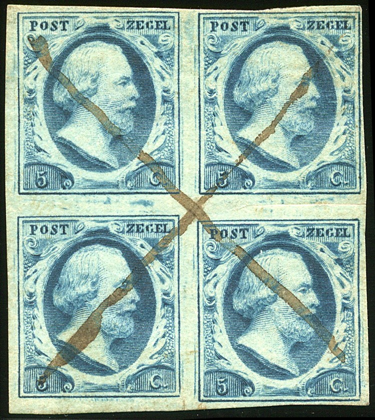 1j-Pl.III-2-3/7-8. Zeer fraai blok van vier, met knip in rand tussen de rechter zegels, rechter bovenzegel rechts en boven wat smal gerand doch nergens aangesneden, het geheel als blok vernietigd met pen getrokken kruis. Aardig albumstuk