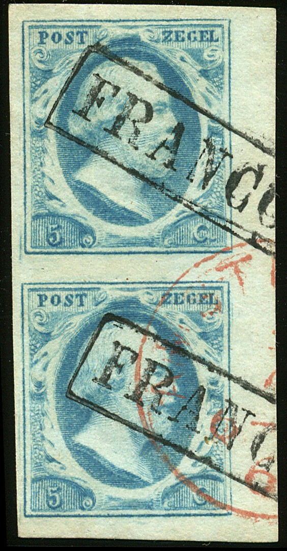 1p-Pl.V-60/65. Breed tot zeer breed gerand verticaal prachtpaar in groenblauwe nuance, waarop tevens rode afstempeling Amsterdam